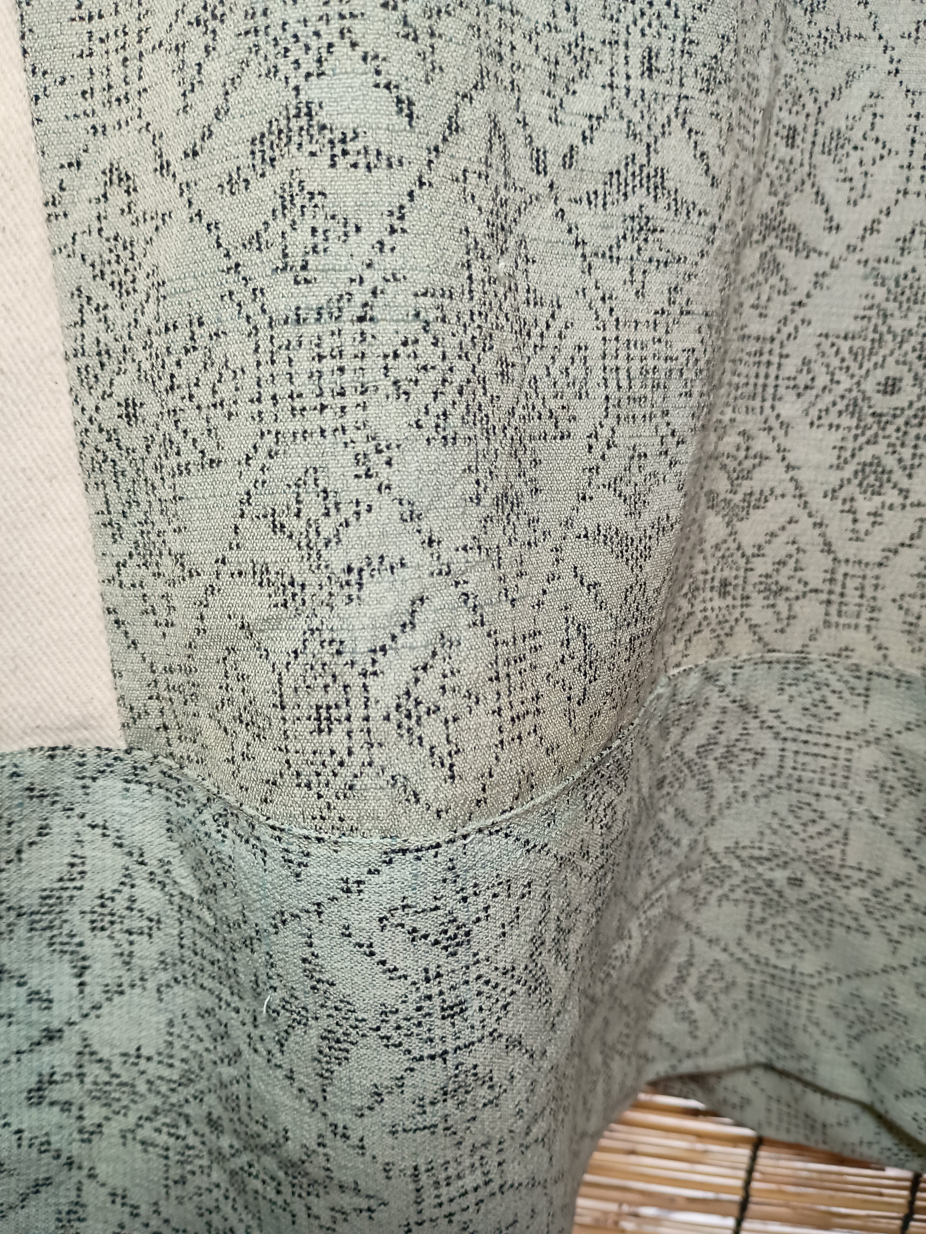 麻の着物と生成りジャケットの生成りのジャケットに薄緑がかったブルーグレーの麻の着物をドッキングさせました。模様は黒で織られてます。●サイズ:フリーサイズ 元のジャケットはLでしたがかなりゆったりしてます。