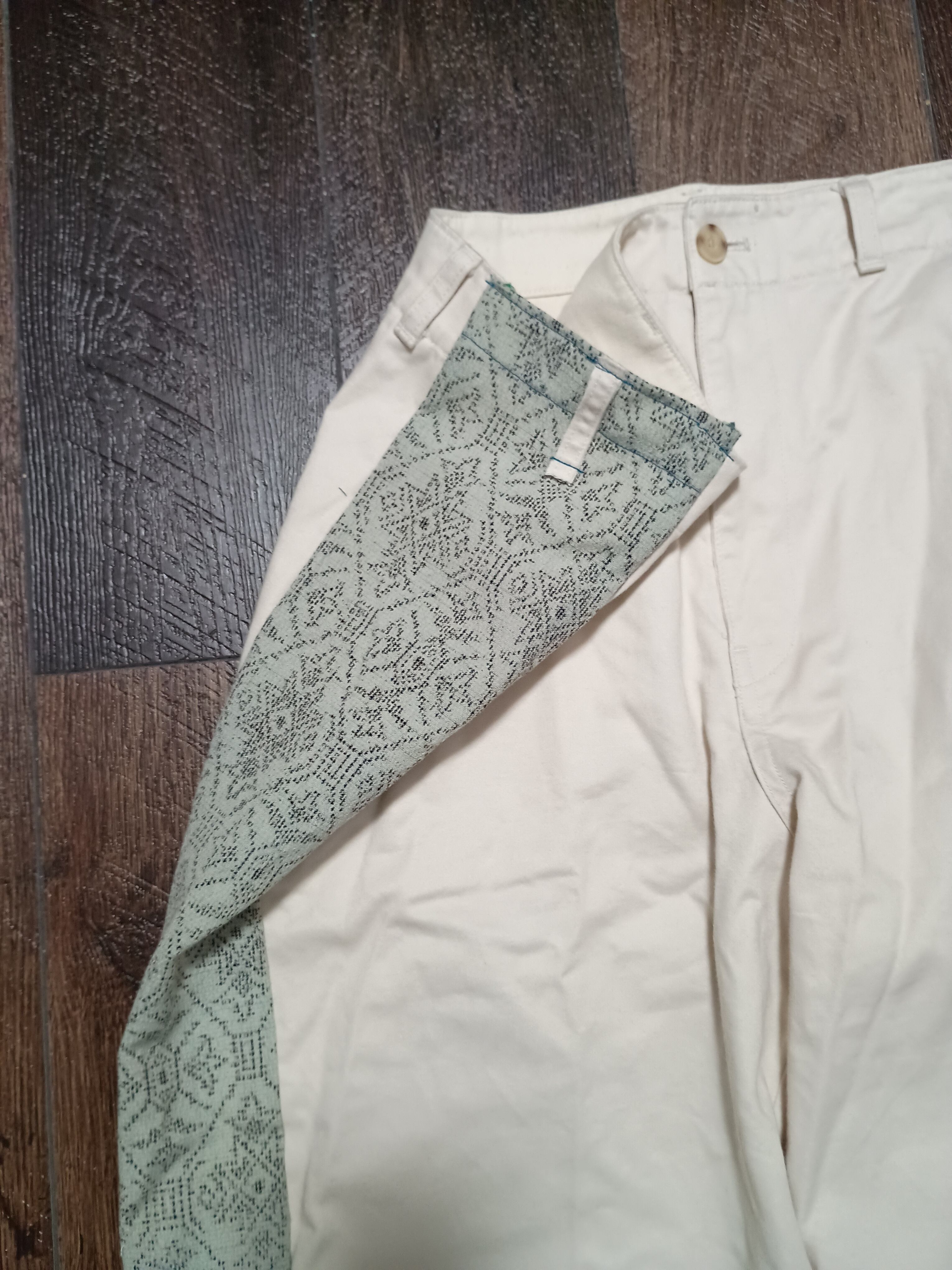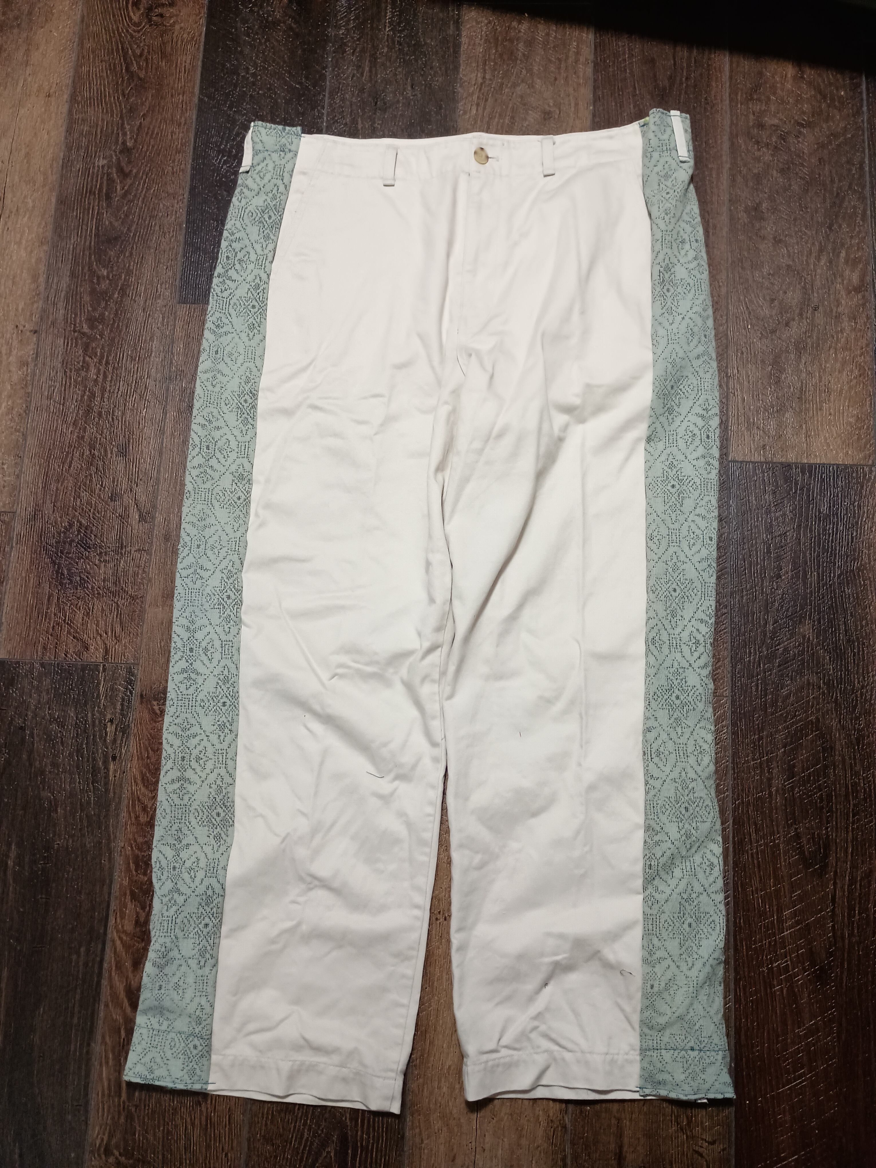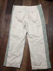 サイドに麻の幾何学模様の着物を施されたオフホワイトのワイドチノパン。ゆったりダボッと楽ちんにお召しいただけたら嬉しいです。